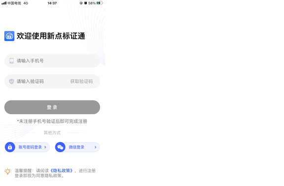 初次使用新点标证通的用户打开app后,输入手机号,点击【获取验证码】,输入正确的验证码,验证成功后即可完成注册,登录app成功,见下图;