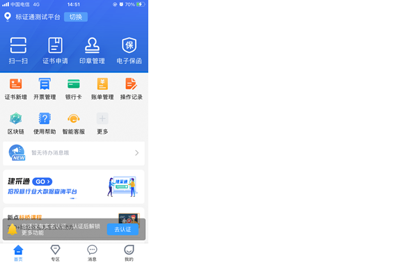 首次登录的账号点击首页底部悬浮窗中的【去认证】按钮,进行实名认证,如下图所示。