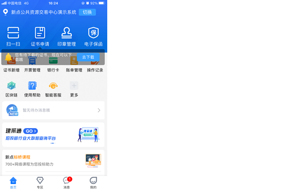 首次申领完证书,并被CA公司审核通过后,用户可通过点击【去下载】按钮,跳转至消息页面,进行证书下载操作,如下图所示。